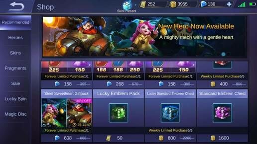 Apabila kamu sudah membeli semua hero yang menggunakan tiket dengan maksimal, maka kamu bisa melakukan pembelian lucky emblem pack yang ada di shop. Hanya dengan 50 tiket, maka kamu akan mendapatkan 45-55 random fragment yang dapat kamu gunakan untuk memperkuat karakter kamu nantinya.